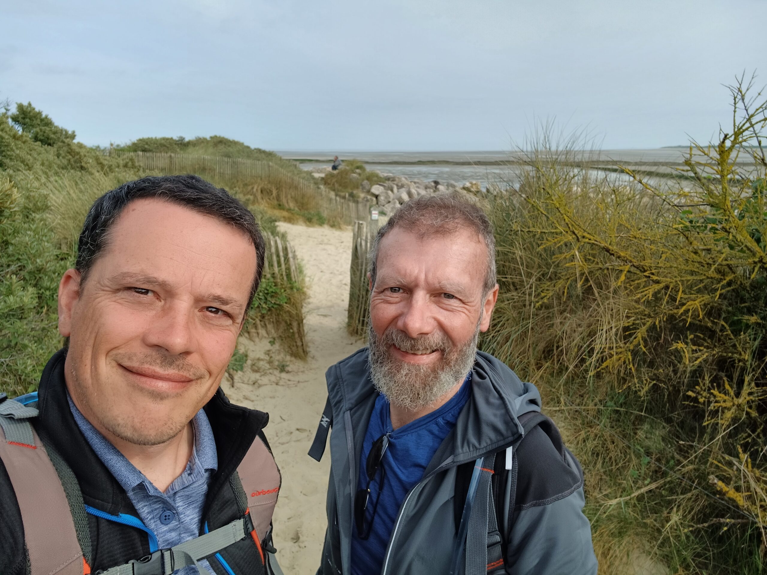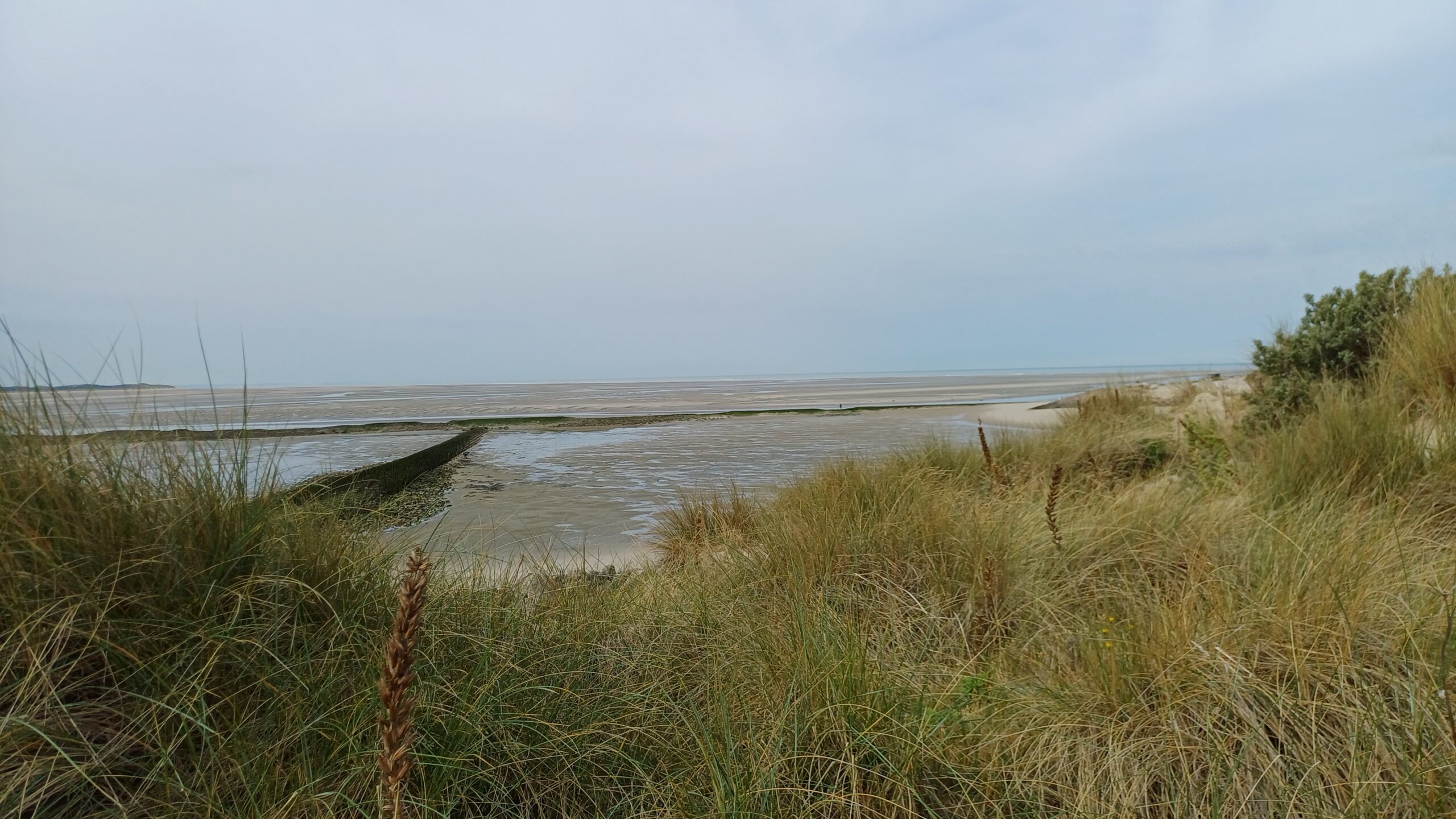 Nous partons randonner pour ne pas attendre avec la foule et à priori on a encore le temps. En route donc dans les dunes et marais. Encore une erreur de parcours. Cette fois je persiste à aller tout droit en pensant retrouver un chemin mais non, c’est vraiment un cul de sac. Deux kilomètres pour rien et pas les plus beaux, parmi les déchets et autres immondices des camps de nomades. Déjà dix bornes quand nous arrivons dans la Baie d’Authie. On met du temps avant de voir la mer, retirée bien loin. On voit l’objectif mais dans ce genre de paysage, ça ne se rapproche pas vite. Et pas moyen de couper avec les rivières. D’ailleurs un peu comme sur une plage au retour de la baignade, on ne sait pas très bien si on marche droit. Est-ce que les phoques sont partis ? Vu le monde sur la jetée, il semble que non. Ils sont là en nombre, tout près et on aura bien le temps de les observer. Certains continuent même de remonter la rivière alors que la mer monte. Superbe moment, avec Cyril on est tout content.