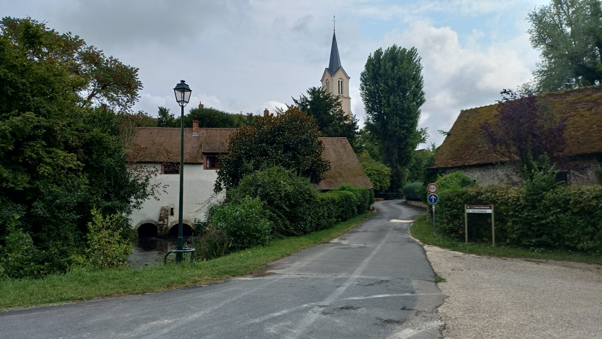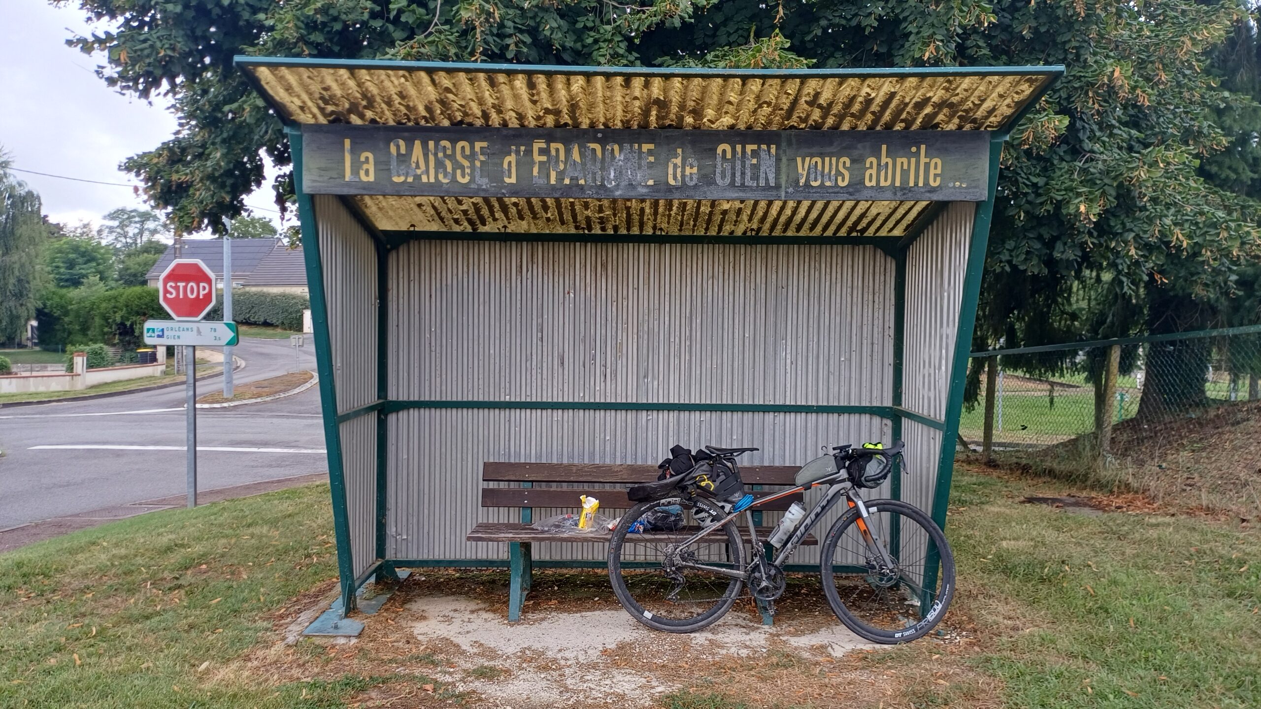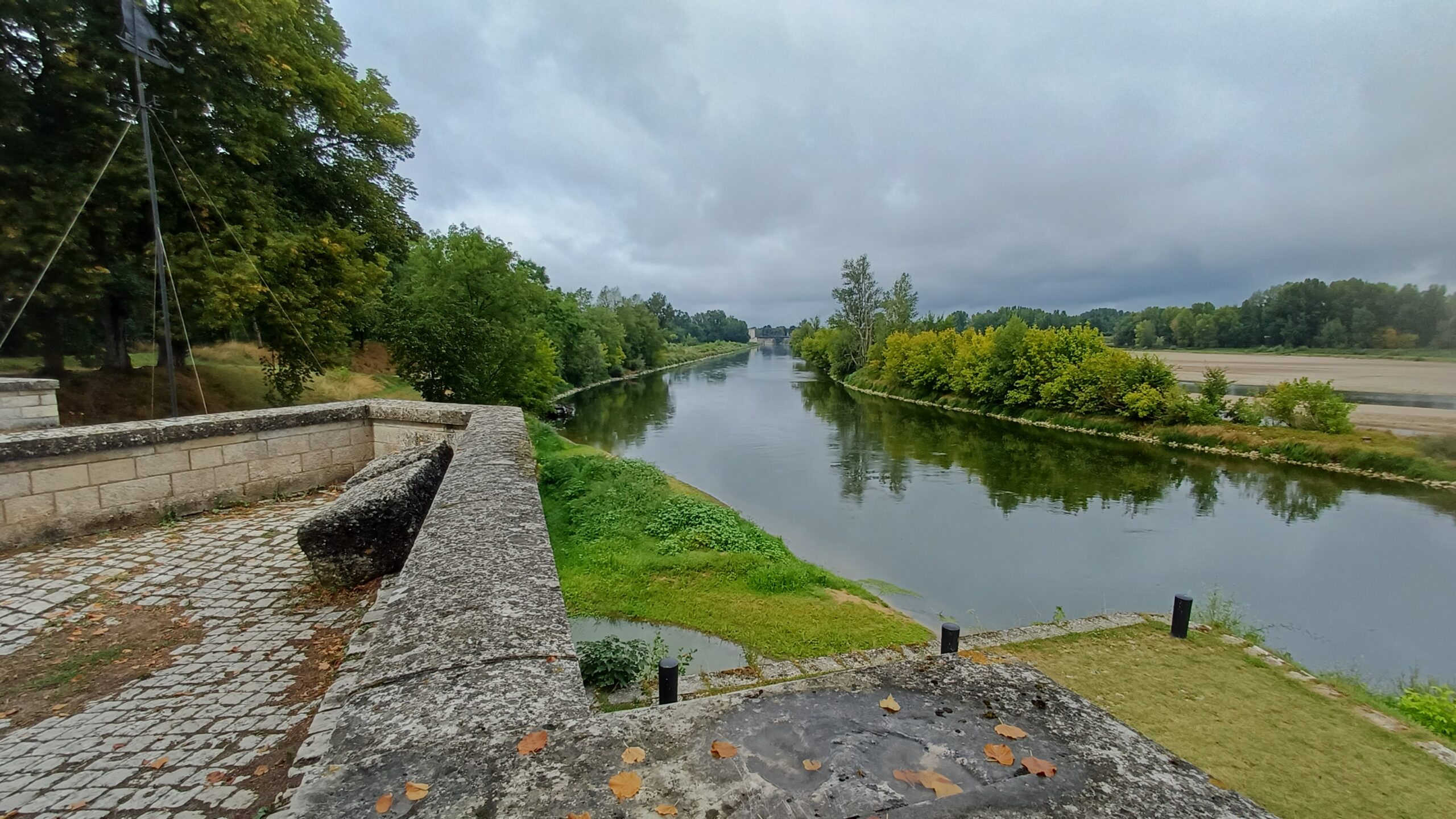 Sur les chemins ça va, sur la route j’évite les flaques car c’est souvent les projections au sol qui mouillent beaucoup. Les chemins blancs en revanche salissent pas mal le vélo, espérons ne pas avoir d’ennui mécanique. Je suis entré dans le département du Loiret où s’achèvera mon périple. Je fais une petite balade à pied du côté de l’ile à Gaston. La pluie s’est arrêtée, je suis relativement sec. C’est en forêt, pas vraiment de point de vue sur le fleuve. En revanche, après hier, j’ai encore un souci de cale. Cette fois la chaussure droite. Je fais attention et justement à un moment je sens qu’il manque quelque chose. Je l’ai perdu. Heureusement en faisant demi tour, j’arrive à la retrouver ainsi qu’un peu plus loin la vis un peu enfoncés dans la terre. Revenu au vélo, je prends un peu de temps pour tout bien refixer. Finalement ces chaussures de randonnée à vélo, ne sont pas tant faites que ça pour marcher. Chaque pas contribue à entamer un petit jeu et à dévisser la cale.